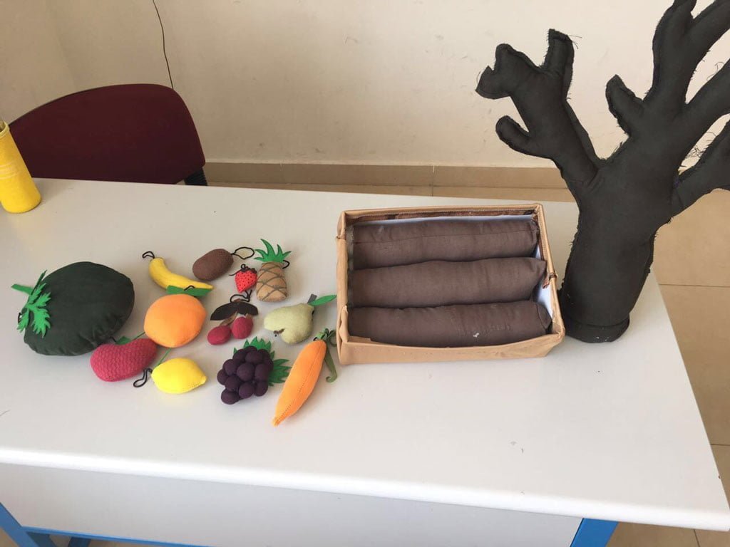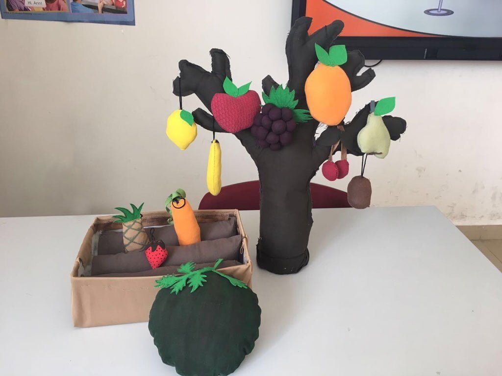 “Fruits-Meyveler” konusu için hazırladığımız materyalimizin amacı hem meyvelerin İngilizcesini pekiştirmek hem de etkinlik aracılığıyla toprakta ve ağaçta yetişen meyvelerimizi tanımaktır. Bu etkinlikle dersin verimliliği arttırılmış ve öğrencilerin dikkati ön planda tutulmuştur. Eğlenerek öğrenmek hedef alınarak konu bu şekilde pekiştirilmiştir. Bu materyalimiz öğrencilerimizin fiziksel olarak hissedebileceği ve meyveleri elle tutulur hale getirme çabası içerisinde hazırlanmıştır. Arta kalan kumaşları ve pamukları değerlendirerek materyalimizin maliyeti de aza indirilmiştir.