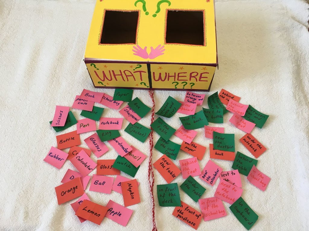 Etkinliğimizin adı “What-Where Box (Ne-Nerede Kutusu)”. Bu çalışmamızda ayakkabı kutusu büyüklüğünde bir kutu bir mukavva parçası yardımıyla ortadan ikiye ayrılmıştır ve dışardan tek bir kutu olarak görünse de içerden 2 bölüme ayrılmış durumdadır. Öğrencilerimizin kelime dağarcığı da göz önünde tutularak kutumuzun “what” bölümüne bazı nesne isimleri, “where” bölümüne de yer edatları kullanılarak bazı kelime grupları yazılır. Daha sonra her öğrenci sırayla kutunun önce “what” bölümünden sonra da “where” bölümünden birer kâğıt seçer ve elindeki seçtiği kağıtlarla anlamlı bir cümle kurar. Eğer cümlesini kurduğu durum sınıfta gösterebileceği bir durumsa bunu görsel olarak da arkadaşlarına gösterir. Örneğin; bir öğrenci “what” bölümünden “book” kelimesini “where” bölümünden ise “under the table” kelime grubunu çekti. Öğrenciden beklenen cümle şuydu; “Book is under the table” ve bu durum sınıf ortamında rahatlıkla gösterilebilecek bir durumdu. Tamamen öğrencilerimizin aktif rol aldığı bu çalışmada, öğrencilerimiz hem eğlendiler hem de eğlenirken yer edatlarını pekiştirdiler, kelime dağarcıklarını genişlettiler.